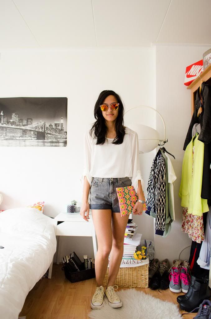 Blouse: Action (soortgelijke hier) | High waisted shorts: Sheinside | Clutch + zonnebril: Action | Gympen: All Stars