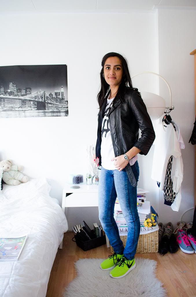 High waisted skinny: H&M (soortgelijke hier) | Jas: Mango | Leren jack: H&M | T-shirt: Coolcat | Sneakers: Nike Roshe Run