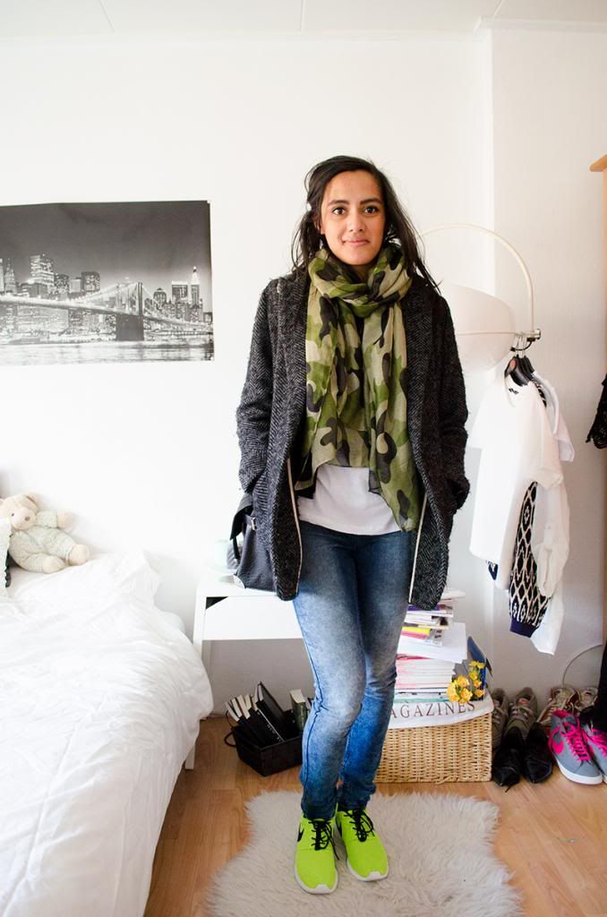 Het is vakantie, maar ik ben druk aan het werk. Niet dat ik dat erg vind, er worden weer centjes verdiend ;). Back to the outfit: af en toe heb je zin een lekker knal kleurtje in je outfit. Ik had zin in kleur in mijn outfit, maar ook in simpele basic kledingstukken. M’n Nike Roshe Run’s waren de gulden middenweg :). De camouflage print sjaal die ik voor een paar euro bij de Action scoorde is een nieuwe favoriet! Zoals ik in deze shoplog al zei is het echt een item die je zo bij Primark tegen het lijf zou lopen. Ik houd van het printje, het maakt je outfit in één klap een stuk minder saai. Net als m’n sneakers natuurlijk!