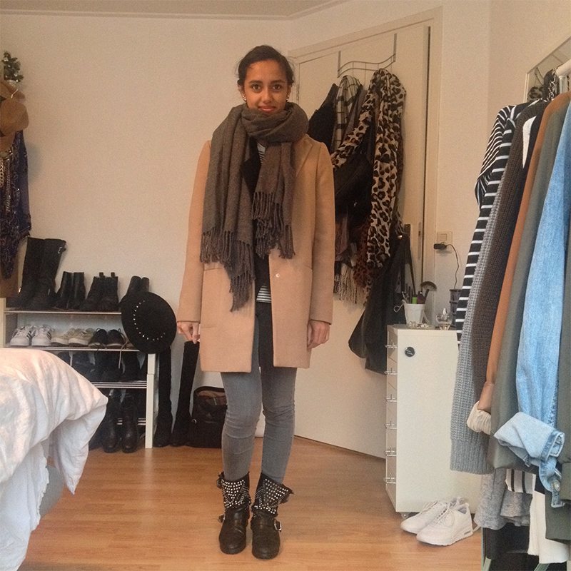 Jas: Primark | Sjaal: Pieces | Gestreept t-shirt: H&M | Broek: Topshop Leigh Jeans | Laarzen: Zara