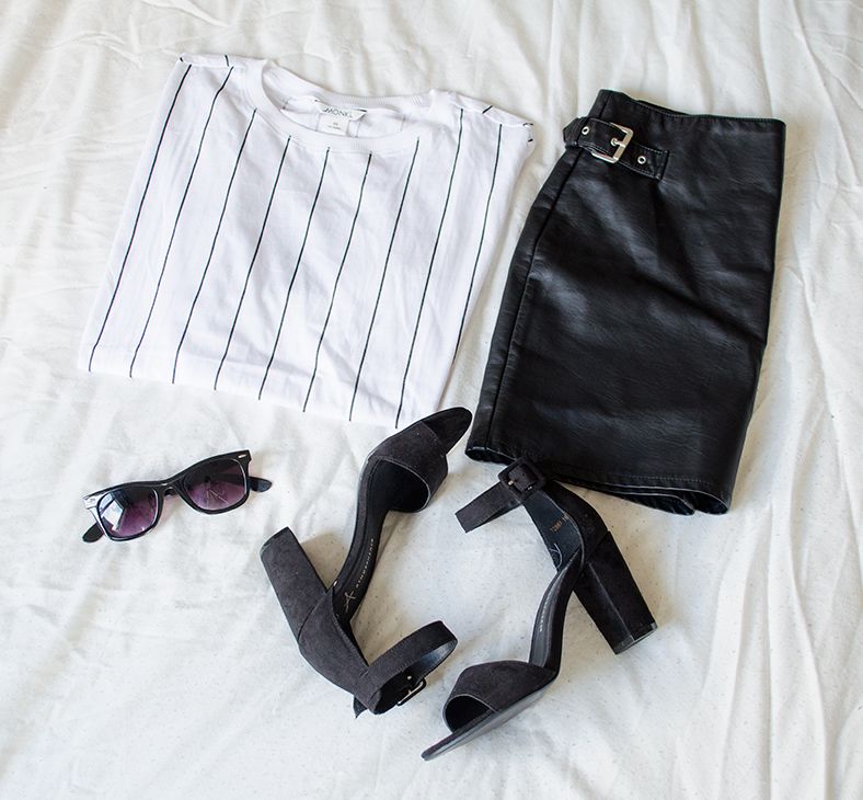 Outfit nummer 2 is wat minder casual (hoewel het T-shirt dat wel weer in balans brengt) en meer sexy door het nep leren rokje en de strappy hakken. Ik zie mezelf het T-shirt zowel tucked in to het rokje dragen als er losjes overheen. Laat die zomerse dagen maar weer terugkomen please!